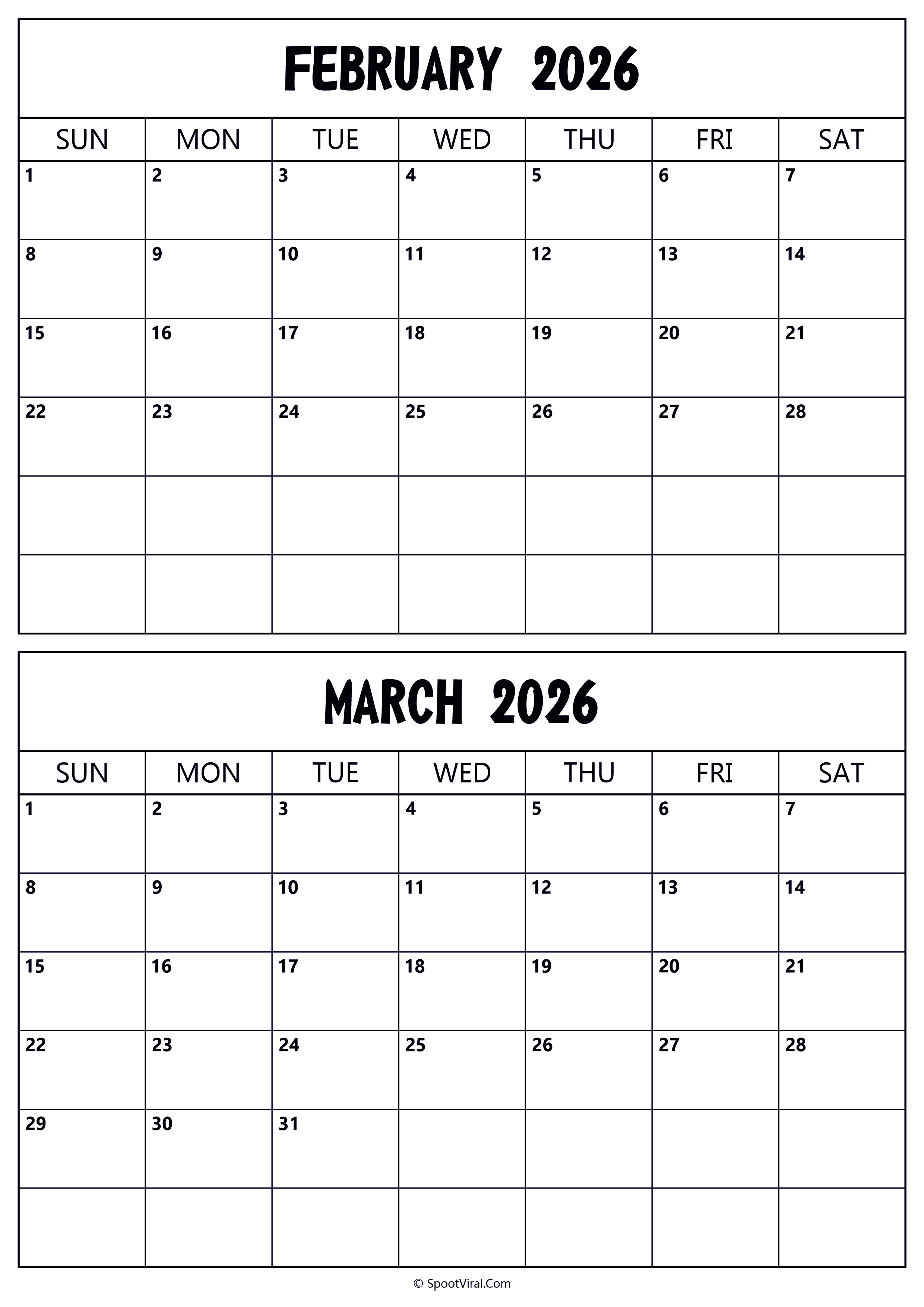 Calendar 2026 February March
