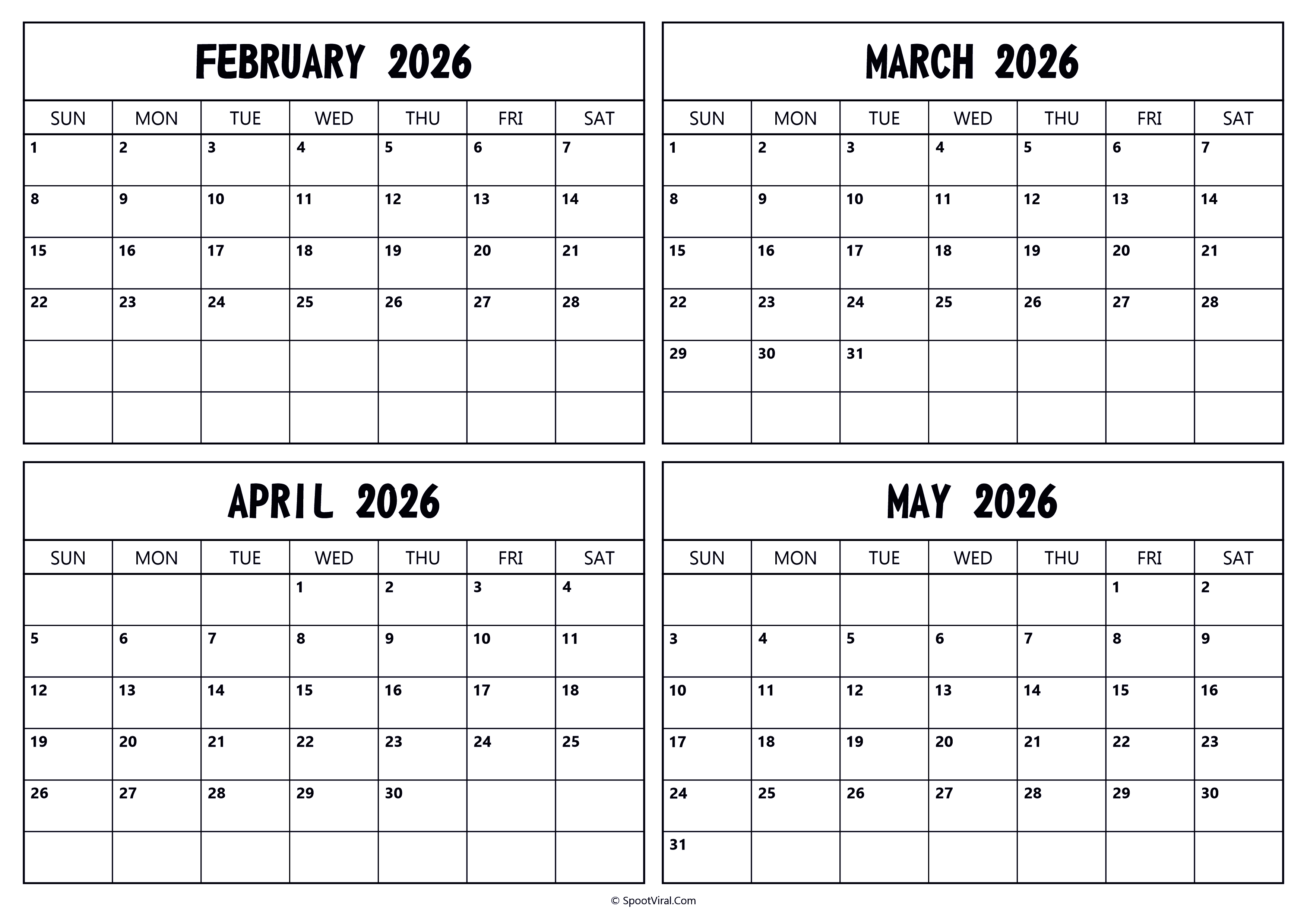 February March April May 2026 Calendar by Admin | Sep 2, 2025 | 0 comments February March April May 2026 Calendar Submit a Comment Cancel replyYour email address will not be published. Required fields are marked *Comment * Name * Email * Website Save my name, email, and website in this browser for the next time I comment.
