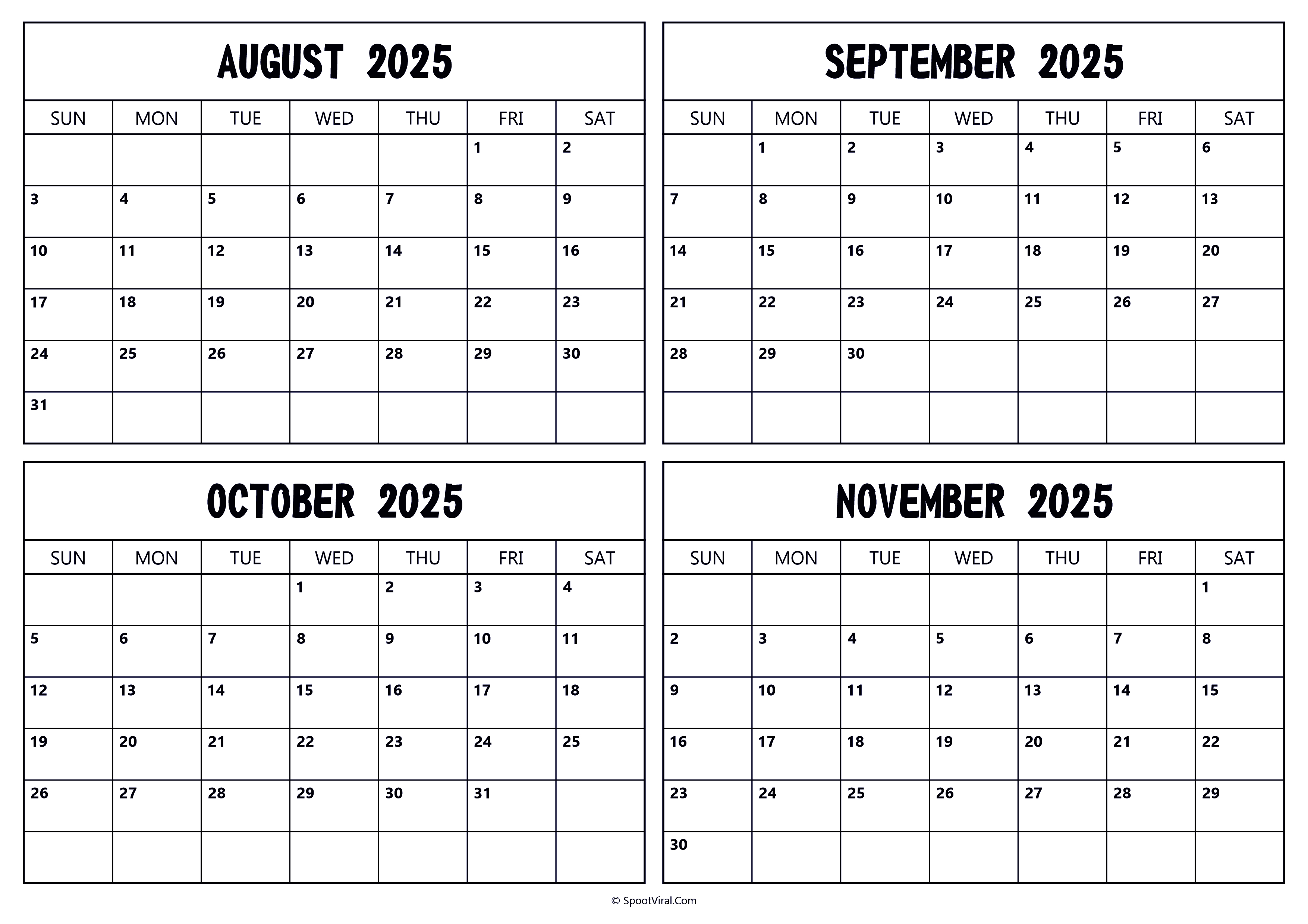 Printable August to November 2025 Calendar
